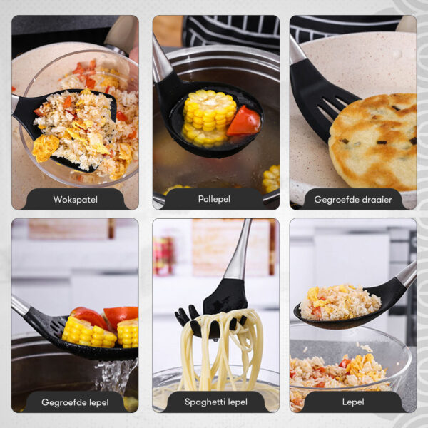 Dankzij de zorgvuldig ontworpen siliconen uiteinden van deze kookset hoeft u zich geen zorgen meer te maken over beschadigde pannen, kommen of schalen. Bovendien is dit kookgerei veilig te gebruiken in pannen met een anti-aanbaklaag. Met een hittebestendigheid tot 250 graden Celsius en een anti-aanbakfunctie voorkomt ons kookgerei dat uw eten blijft plakken, waardoor het opscheppen een fluitje van een cent wordt. De hele set is vaatwasserbestendig en kan ook gemakkelijk met de hand worden schoongemaakt. Dankzij het ophangbare ontwerp kunt u de set netjes opbergen in een keukenla of kast. Bovendien is ons kookgerei volledig vrij van BPA, latex en plastic, waardoor het absoluut veilig is voor uw gezondheid.